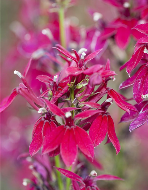 Die Lobelie (Lobelia x speciosa) ist eine aufrechte Staude, die, je nach Sorte, Blüten in verschiedenen Farben bildet. An einem sonnigen bis halbschattigen Standort mit durchlässigem, nährstoffreichem Boden erreicht sie gewöhnlich eine Höhe von ca. 1,2 m und wird ca. 80 cm breit. Die Lobelie ist gut frostverträglich.