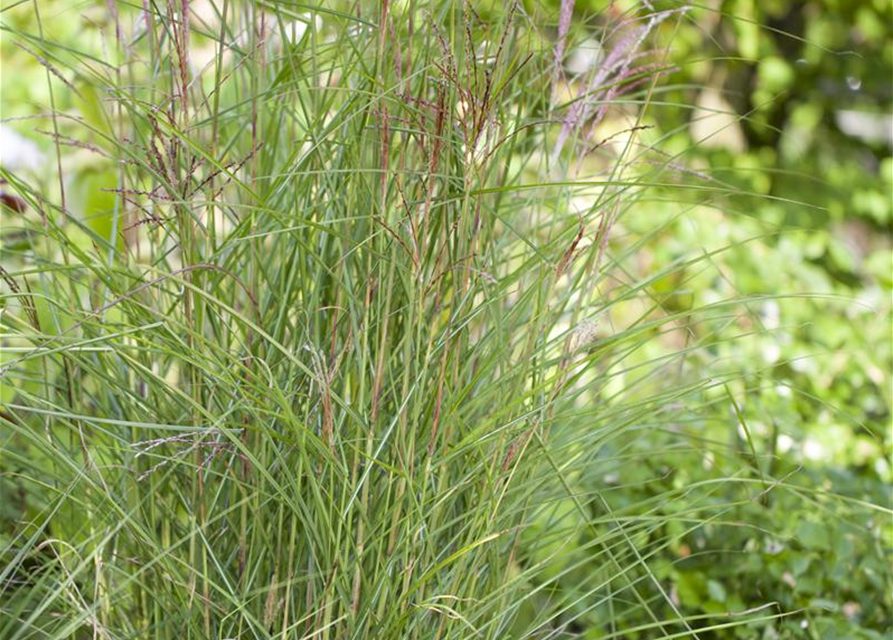 Das Garten-Chinaschilf 'Kleine Fontäne' (Miscanthus sinensis) ist mit seiner mittelgrünen Blattfärbung ein dekoratives Gestaltungselement im Garten, welches sich an einem sonnigen bis halbschattigen Standort mit einem möglichst durchlässigen, humosen, nährstoffreichen Boden am wohlsten fühlt. Die hellrosafarbenen Blütenwedel schmücken die aufrecht wachsende Pflanze ab Sommer. Bei günstigen Bedingungen erreicht dieses winterharte Gras eine Höhe von ca. 1,1 m und wird bis zu 80 cm breit.