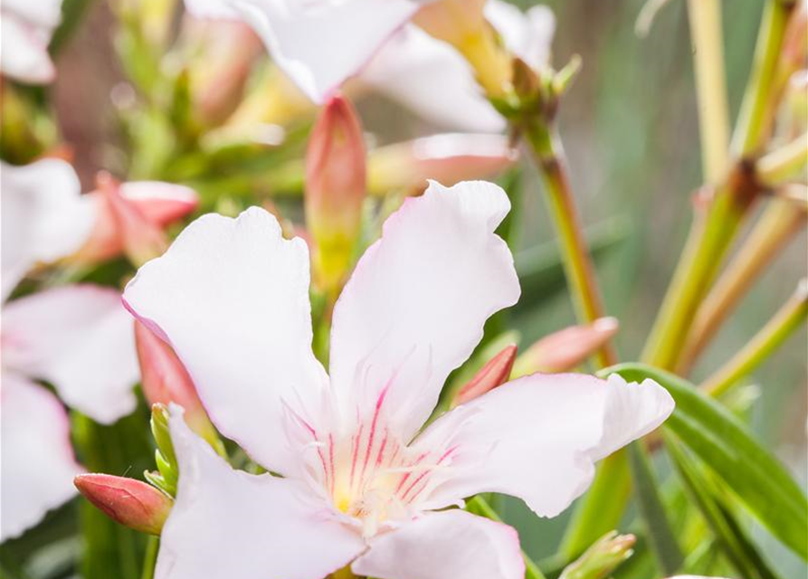 Nerium oleander, weiß bildet während der gesamten Saison zahlreiche weiße Blüten.