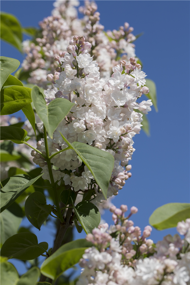 Die weißen Blüten des Edelflieder erscheinen in Rispen von Mai bis Juni. Diese werden etwa 12 - 15 cm groß und sind stark duftend.