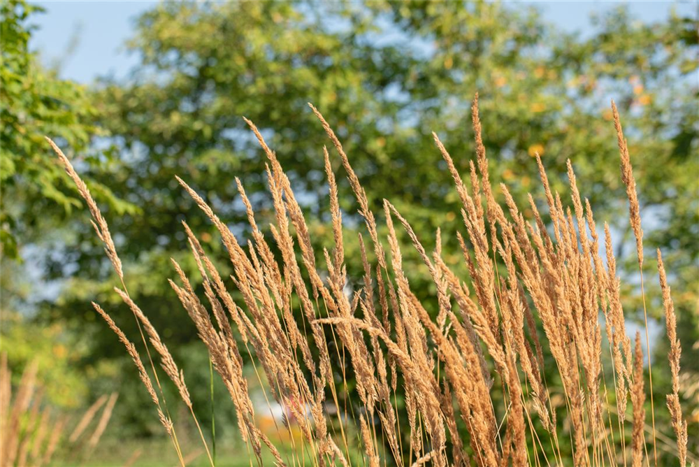 Das Garten-Reitgras 'Karl Foerster' (Calamagrostis x acutiflora) ist mit seiner mittelgrünen Blattfärbung ein dekoratives Gestaltungselement im Garten, welches sich an einem sonnigen Standort mit einem möglichst durchlässigen, lockeren, nährstoffreichen, sandigen Boden am wohlsten fühlt. Die braunen Blütenwedel schmücken die aufrecht wachsende Pflanze ab Sommer. Bei günstigen Bedingungen erreicht dieses winterharte Gras eine Höhe von ca. 1,5 m und wird bis zu 1 m breit.