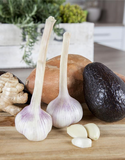 Der Echte Knoblauch (Allium sativum) bildet Zwiebeln, die pikant schmecken und bereits ab Juli geerntet werden können. Für das optimale Wachstum des Echten Knoblauchs werden ein sonniger Standort und durchlässiger, nährstoffreicher Boden benötigt.
