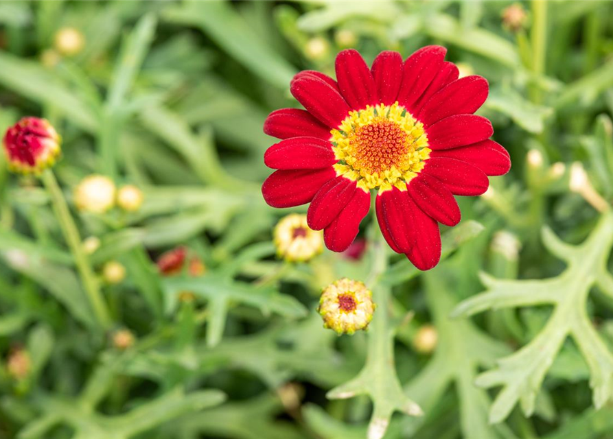Argyranthemum frutescens, rot bildet während der gesamten Saison zahlreiche körbchenartige, rote Blüten.