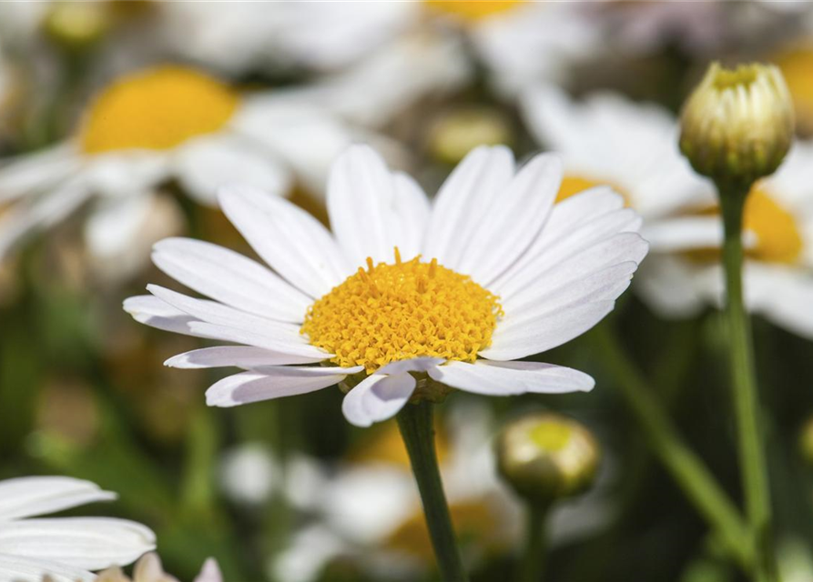 Die Strauchmargerite (Argyranthemum frutescens) ist eine beliebte Pflanze für den Balkon, die während der gesamten Saison unzählige weiße Blüten bildet. Ein sonniger Standort und ein durchlässiges Substrat werden bevorzugt.