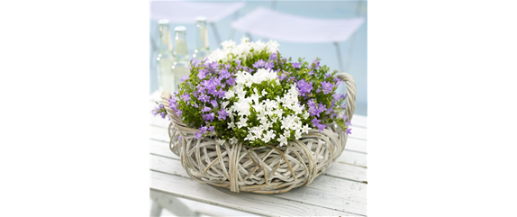 So einfach und doch so schön – ein Gefäß mit Pflanzen einer Sorte aber in verschiedenen Farben. Wie hier: die Glockenblumen (Campanula portenschlagiana) wurden in Weiß und Lila gegenüberliegend in den Korb gesetzt.
