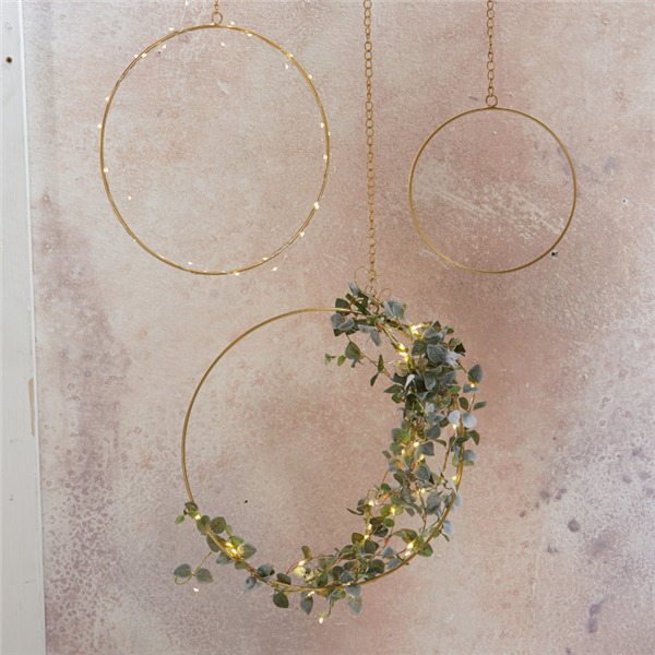 Grau-grüne Eukalyptus-Ranken winden sich perfekt um den goldenen Topf. Dadurch wird seine strenge Form ganz natürlich aufgelockert.